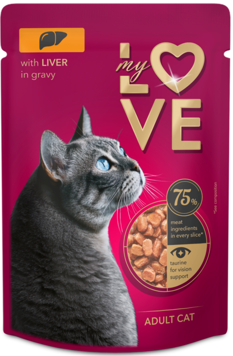My Love konservai su kepenėlėmis padaže suaugusioms katėms My Love drėgnuose ėdaluose yra taurino, svarbaus komponento, kuris palaiko kačių...