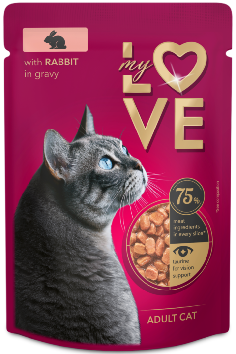 My Love konservai su triušiena ir kalakutiena padaže suaugusioms katėms My Love drėgnuose ėdaluose yra taurino, svarbaus komponento, kuris...