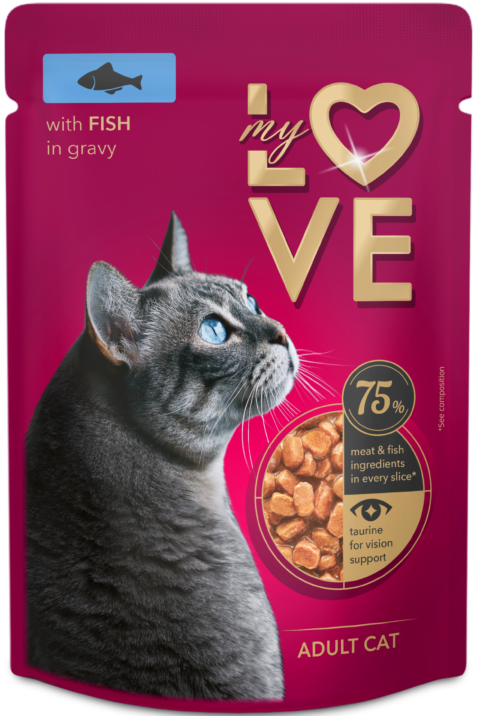 My Love konservai su žuvim padaže suaugusioms katėms My Love drėgnuose ėdaluose yra taurino, svarbaus komponento, kuris palaiko kačių...
