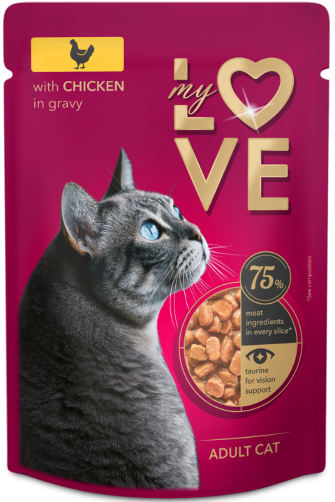 My Love konservai su vištiena padaže suaugusioms katėms My Love drėgnuose ėdaluose yra taurino, svarbaus komponento, kuris palaiko kačių...