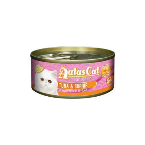 Aatas visavertis pašaras katėms, su tunuir krevetės drebučiuose.