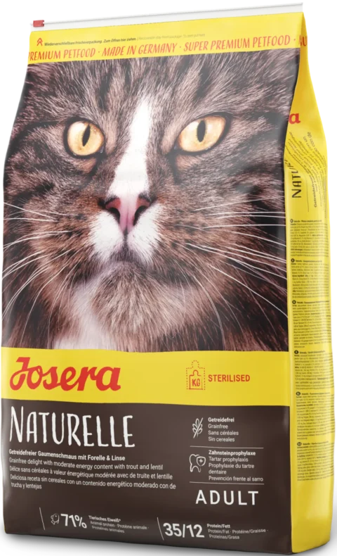 Josera Naturelle su upėtakiais ir lęšiais, be grūdų ir vidutiniu kiekiu riebalų optimaliam kačių šėrimui.Sterilizuotoms Be grūdų Dantų...