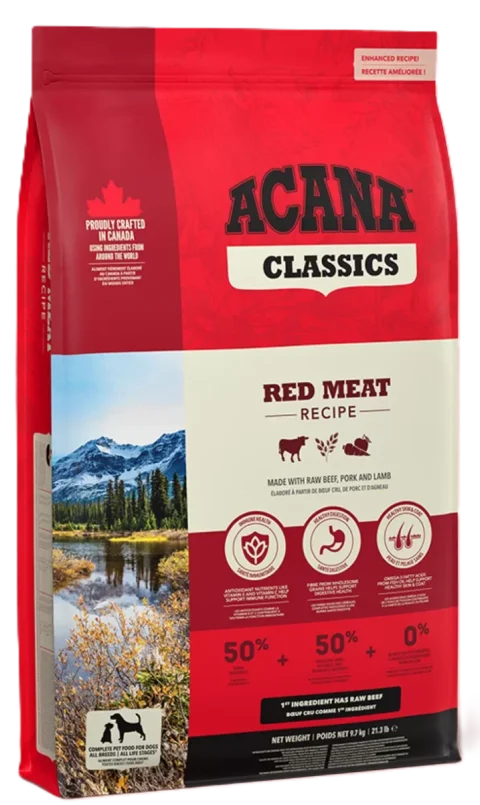Acana Classics Red Meat visų veislių bei amžiaus grupių šunims, receptas yra puikiai subalansuotas, 50/50. Sudėtyje gausu kokybiškos mėsos...