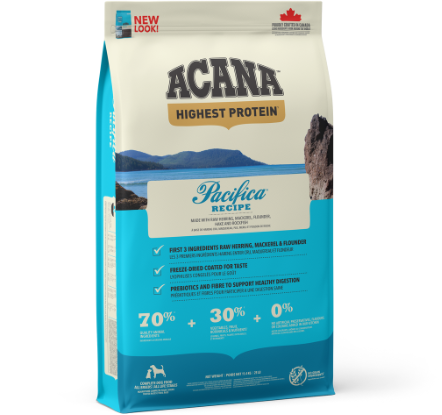 Acana Pacifica visų veislių bei amžiaus grupių šunims, recepte yra net 70% kokybiškų gyvūninių ingredientų, tokių kaip silkė, lašiša ir plekšnė. Gyvūniniai ingredientai taip pat subalansuoti su vaisiais, daržovėmis ir žolelėmis, šie ingredientai sudaro apie 30%.