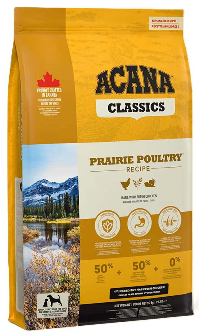 Acana Prairie Poultry visų veislių bei amžiaus grupių šunims, pašare gausu laisvai laikomų vištų mėsos. 50% laisvai laikomos paukštienos, 50% vaisių, daržovių, augalų, skaldytų avižų, vitaminų ir mineralų. Be GMO, bulvių ir tapijokos.