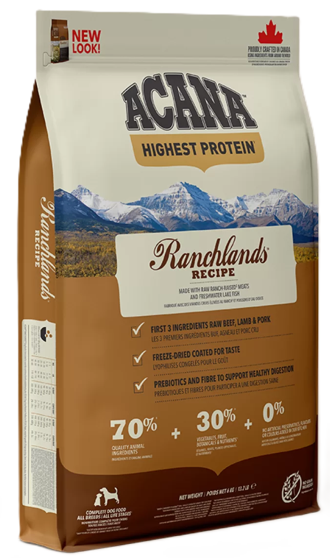 ACANA Ranchlands visų veislių bei amžiaus grupių šunims, recepte yra net 70 % kokybiškų gyvūninių ingredientų, tokių kaip rančoje užauginta jautiena, kiauliena, ėriena, gėlavandenės žuvys ir bizoniena. Gyvūniniai ingredientai subalansuoti su šviežiais vaisiais, daržovėmis ir žolelėmis, šie ingredientai sudaro apie 30 %.