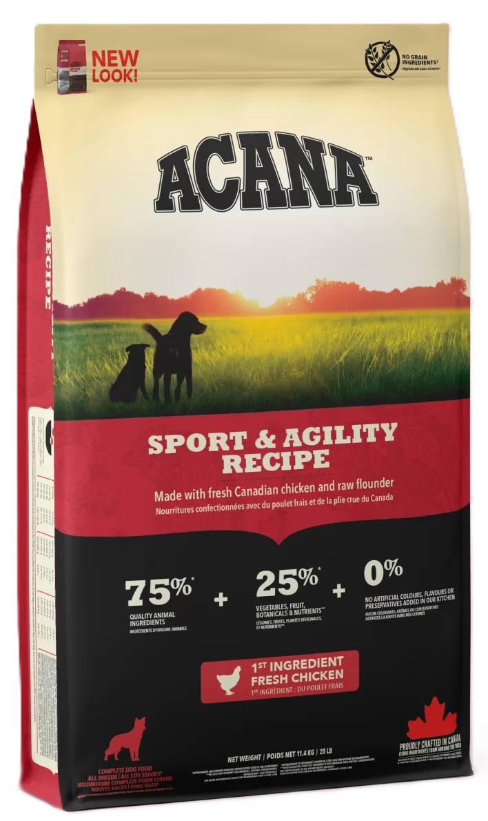 Acana Sport&Agility visų veislių, suaugusiems, aktyviems šunims, recepte net 75% kokybiškų gyvūninių ingredientų, tokių kaip šviežia kanadietiška vištiena ar neapdirbta jūrinė lydeka. Gyvūniniai ingredientai subalansuoti su vaisiais, daržovėmis ir žolelėmis, šie ingredientai sudaro apie 25%.