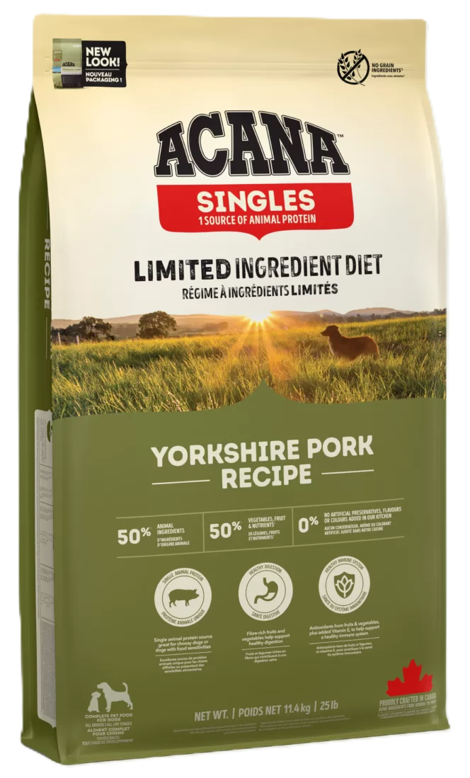 Acana Yorkshire Pork receptas su 50% aukščiausios kokybės kiaulienos ingredientų yra kupinas baltymų iš vieno gyvūninio šaltinio ir subalansuotas su 50% daržovių, vaisių ir maistinių medžiagų, kad palaikytų sveiką virškinimą, puikiai tinka išrankiems arba jautriems maistui šunims.
