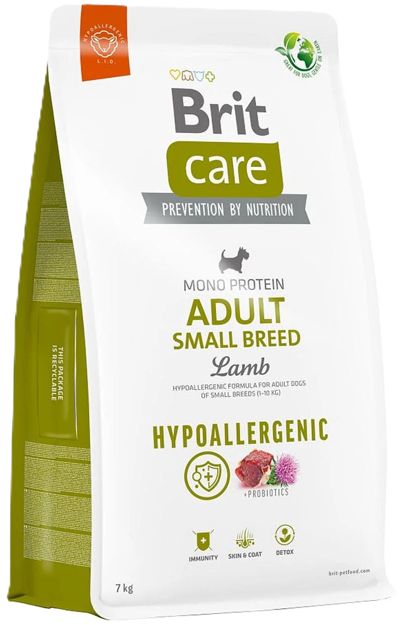 Brit Care Adut Small Breed with Lamb sausas maistas šunims. Hipoalerginė formulė su ėriena ir ryžiais mažų veislių (1-10 kg) suaugusiems šunims. Mažų veislių šunims reikia daug energinės vertės turinčio pašaro, kuris, duodamas nedidelėmis porcijomis, patenkintų šių aktyvių šunų mitybos poreikius. Todėl super premium klasės šunų maistas Brit Care Hypoallergenic Adult Small Breed Lamb & Rice yra puikus pasirinkimas mažų veislių šunų šeimininkams. Hipoalerginė formulė su dideliu kiekiu baltymų ir riebalų, kad būtų patenkinti didesni mažų veislių šunų energijos poreikiai.