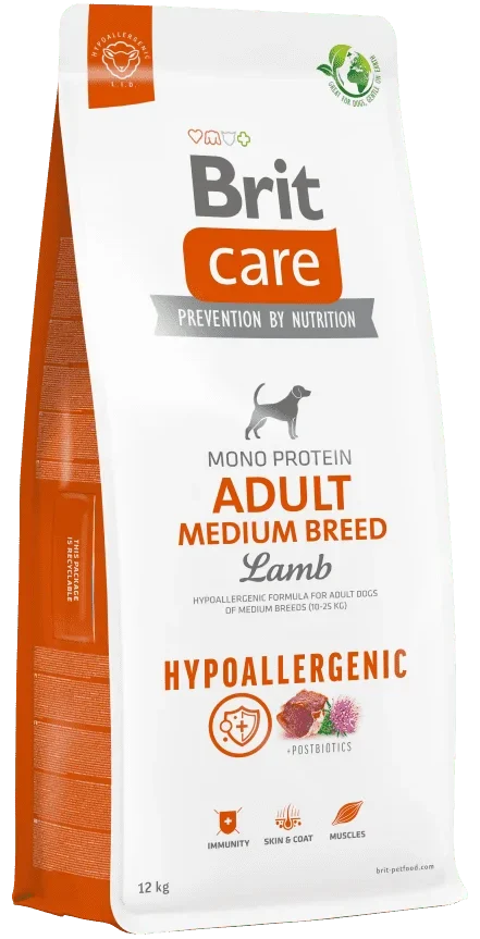 Brit Care Adult Medium Breed with Lamb sausas maistas šunims. Hipoalerginės linijos receptas su ėriena ir ryžiais skirtas suaugusiems vidutinių veislių šunims (10 – 25 kg). Aukščiausios kokybės hipoalerginis pašaras su vienos rūšies gyvūniniais baltymais, skirtas alerginių reakcijų prevencijai. Idealiai tinka suaugusiems vidutinių veislių šunims, turintiems normalų energijos poreikį. Atrinkti baltymų šaltiniai yra nealergiški, ir tai minimalizuoja alerginių reakcijų tikimybė. Šis pašaras ypač tinka šunims su jautriu virškinimu, šunims su specialiais mitybos reikalavimais, ir šunims, kuriems gresia alergijos maistui vystymasis.