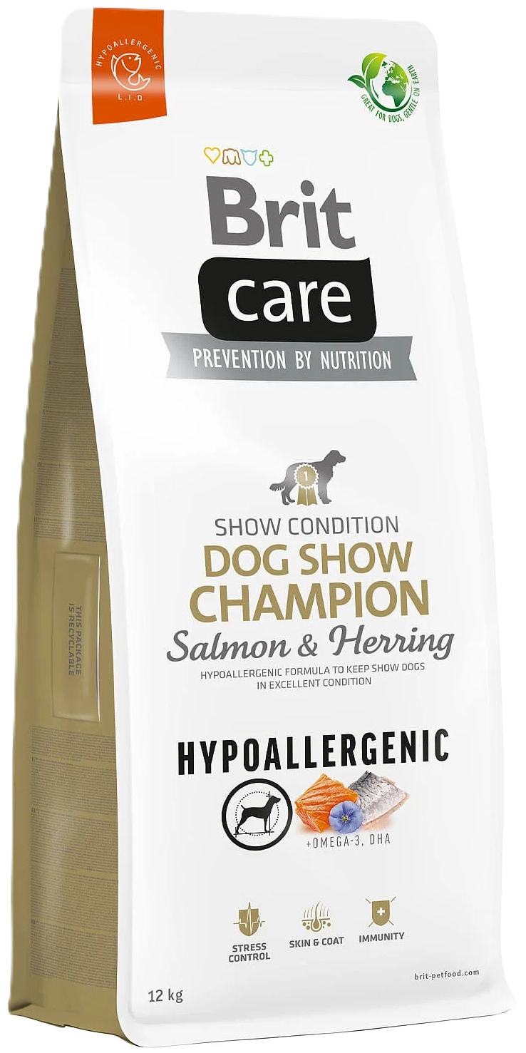 Brit Care Dog Show Champion with Salmon and Herring sausas maistas šunims. Hipoalerginės linijos receptas su lašiša ir silke skirtas šunims, kurie dalyvauja parodose. Aukščiausios kokybės hipoalerginis pašaras su vienos rūšies gyvūniniais baltymais buvo sukurtas palaikyti puikią parodose dalyvaujančių šunų būklę. Omega-3 riebalų rūgštys, tokios kaip ALR, EPR ir DHR, padidina odos drėkinimą, padeda išlaikyti kailį sveiką ir blizgantį. L-triptofanas suteikia raminančią paramą stresinėse situacijose, o paprastoji sukatžolė padeda sumažinti nerimą. Receptas yra praturtintas probiotikais, užtikrinančiais sveiką žarnyno mikroflorą, ir tikruoju margainiu, palaikančiu kepenų veiklą, valančiu organizmą ir pašalinančiu iš jo kenksmingus toksinus.