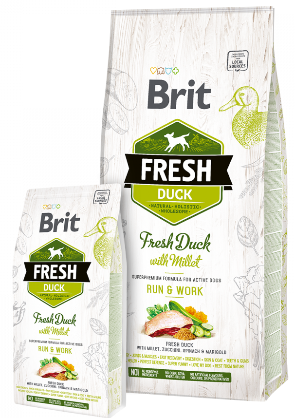 Brit Fresh Duck with Millet Active. Superpremium klasės visavertis pašaras aktyviems šunims su antiena ir soromis. Holistiniai pašarai, pagaminti švelniais metodais, naudojant 40 % šviežios mėsos. Visavertis ėdalas šunims.