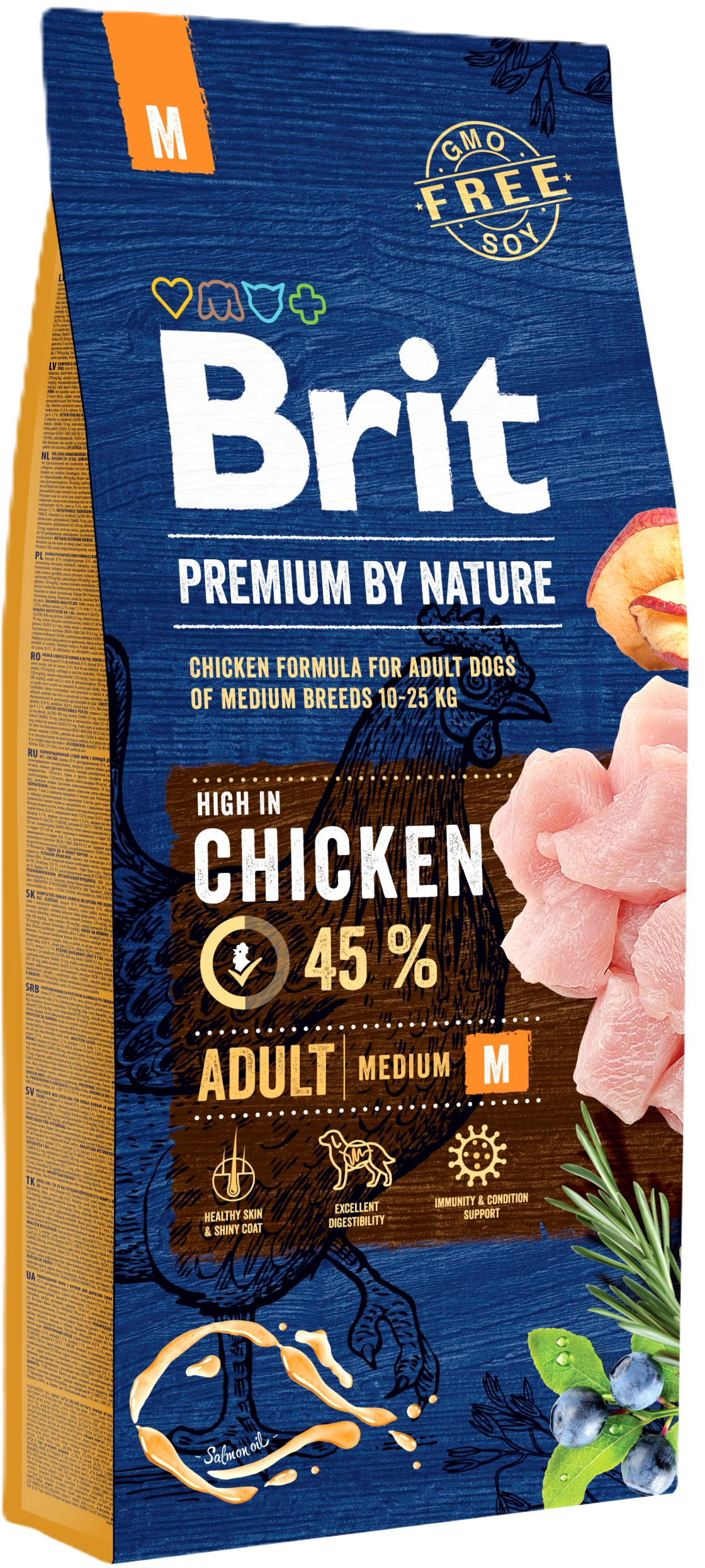 Visavertis pašaras Brit Premium Adult M vidutinio dydžio veislių (10 –25 kg) suaugusiems šunims. Pasižymi tokiomis savybėmis, turinčiomis įtakos šunų sveikatai ir būklei: Blizgantis, minkštas kailis ir sveika oda – tokiomis savybėmis pasižymi Brit Premium Adult M mėgstantys šunys (dėka omega 3 nesočiųjų riebalų rūgščių, esančių lašišos aliejuje). Stiprus imunitetas. Prebiotikai (manano ir fruktooligosacharidai) ir natūralūs antioksidantai stiprina šunų imunitetą. Gyvybingumą užtikrina pakankamas vitaminų ir mikroelementų kiekis. Puikus virškinimas.