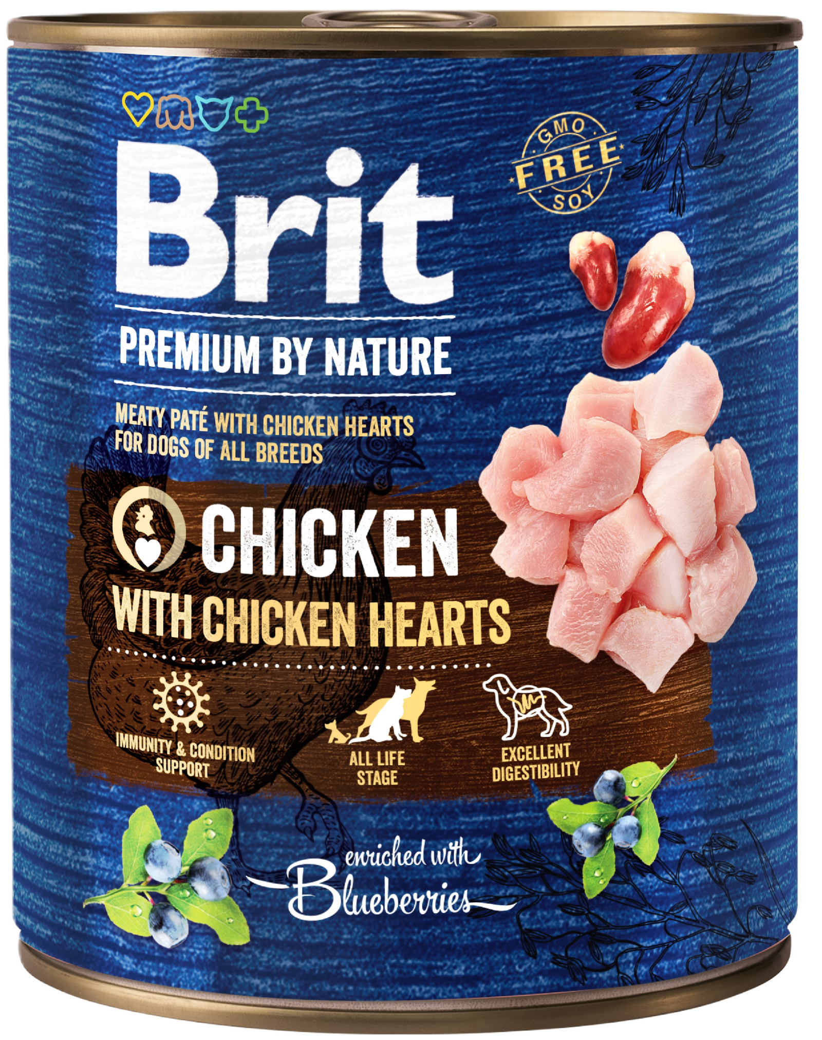 Mėsos paštetas šunims su vištiena ir vištų širdelėmis. Yra idealus papildas granulėms. Visavertis ėdalas, užkandis arba skanus papildas – granulės, skirtos visų veislių suaugusiems šunims. Jis padeda pagerinti maisto suvartojimą ir papildyti skysčius. Sudėtyje yra mėlynių imunitetui palaikyti, lašišų aliejaus, vaisių ir žolelių.