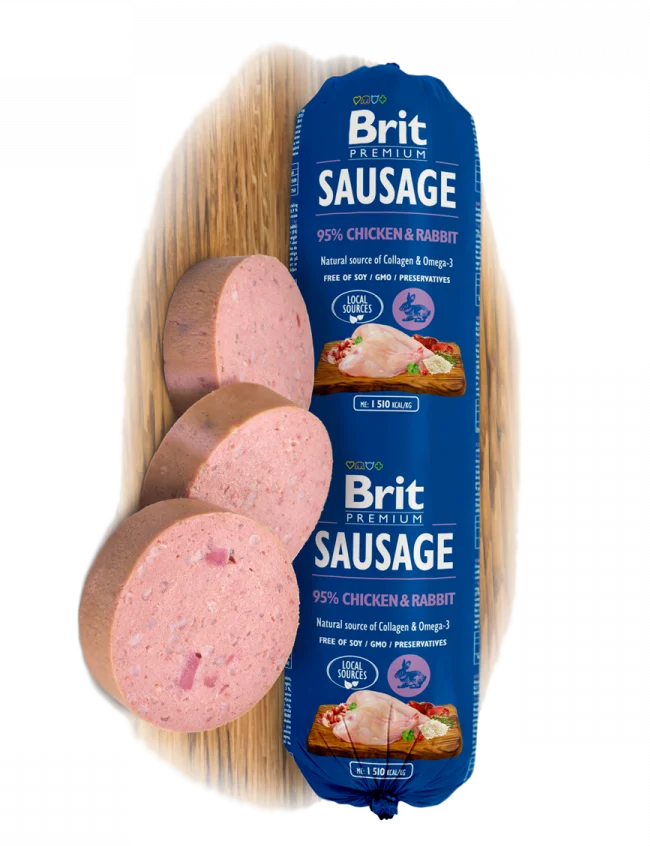 Brit Premium Sausage 95 % Chicken & Rabbit. Visavertis ėdalas šunims. Skanus mėsos ėdalas su triušiena paįvairins mitybą ir bus naudingas kiekvienam šuniui. Dėl gausaus gyvūninių baltymų kiekio palaiko maisto įsisavinimą, prisidėdamas prie geresnio Jūsų augintinių virškinimo.