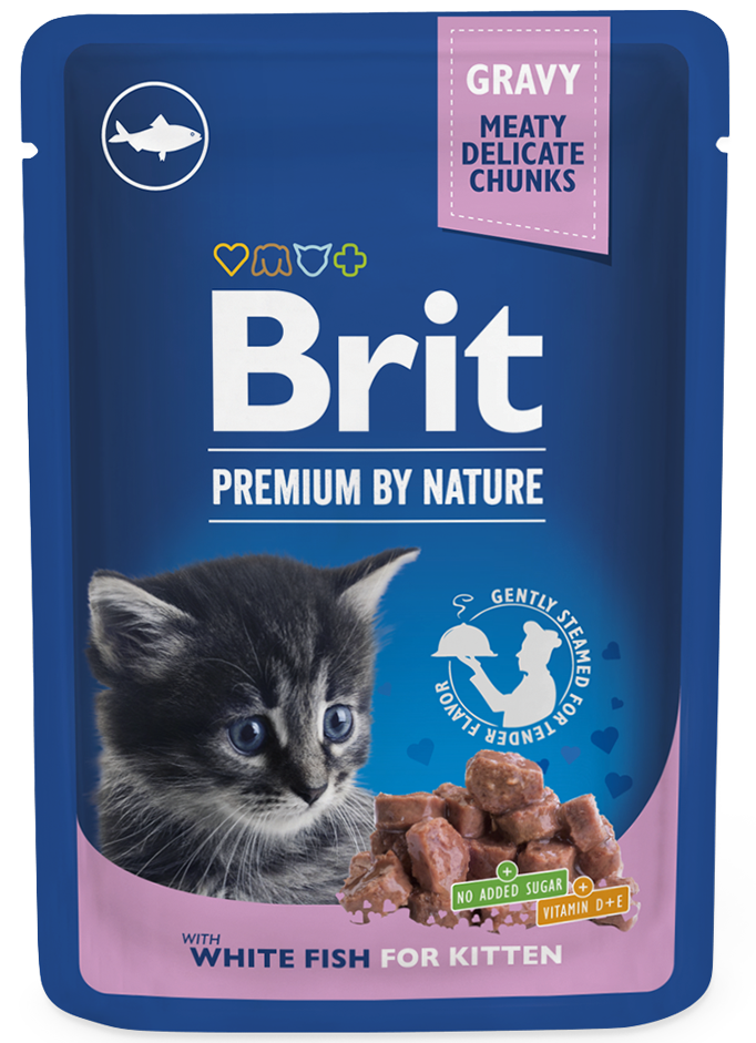 Baltosios žuvies gabaliukai padaže kačiukams. Konservai Brit Premium White Fish aukščiausios kokybės visaverčiai konservai skirti jauniems kačiukams. Su baltos žuvies gabaliukais padaže.