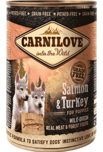 Carnilove Salmon & Turkey for puppies, drėgnas begrūdis pašaras su dideliu kiekiu mėsos visų veislių šuniukams (1-12 mėnesių). Leiskite savo šuniui sugrįžti į laukinius miškus ir gyventi tikrojo medžiotojo gyvenimą – kaip gyveno jo protėvis vilkas, kurio maistą pirmiausiai sudarė šviežia sumedžiota mėsa ir vaisiai su uogomis iš miškų ir pievų. Lašiša yra gerai virškinamų baltymų šaltinis. Tai yra gausus omega-3 nesočiųjų riebalų rūgščių šaltinis, kurie teigiamai veikia psichinį vystymąsi, širdies ir kraujagyslių sistemą ir medžiagų apykaitą (sumažina cukraus kiekį kraujyje). Lašiša teigiamai veikia plaukų ir odos būklę. Kalakutiena yra turtingas virškinamųjų baltymų šaltinis, kurios sudėtyje yra daug mikroelementų, ypač cinko. Taip pat joje yra vitaminų B3 ir B6, kurie palaiko smegenų veiklą, raumenų tonusą ir yra būtini sveikam augimui.
