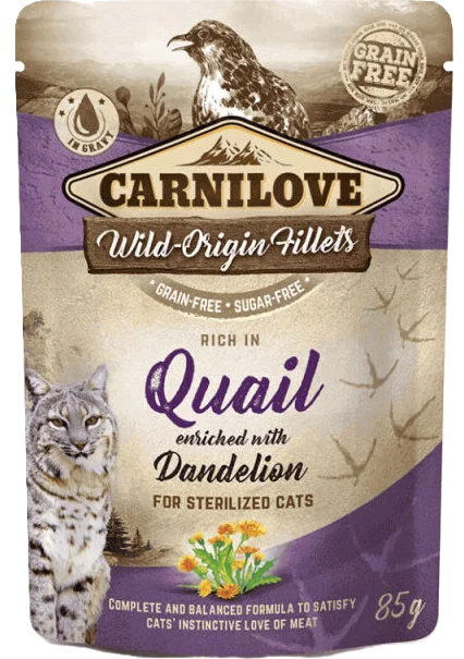Carnilove Quail Dandelion visavertis aukštos kokybės konservuotas pašaras katėms. Didelis kiekis putpelių mėsos su kiaulpienėmis. Hipoalerginė ir lengvai virškinama putpeliena Didelis polinesočiųjų riebalų rūgščių kiekis apsaugo širdį ir kraujotakos sistemą. Didelis seleno kiekis apsaugo ląsteles nuo oksidacinio streso, padedant gerinti odos, sąnarių ir smegenų kokybę. Kadangi kiaulpienėse gausu antioksidantų, jos turi priešuždegiminių savybių ir palaiko sveiką odą, širdį, šlapimo sistemą ir dantenas. Sumažina cholesterolio kiekį kraujyje, padedant apsaugoti širdį ir kraujotakos sistemą, taip pat sumažina gliukozės kiekį kraujyje.