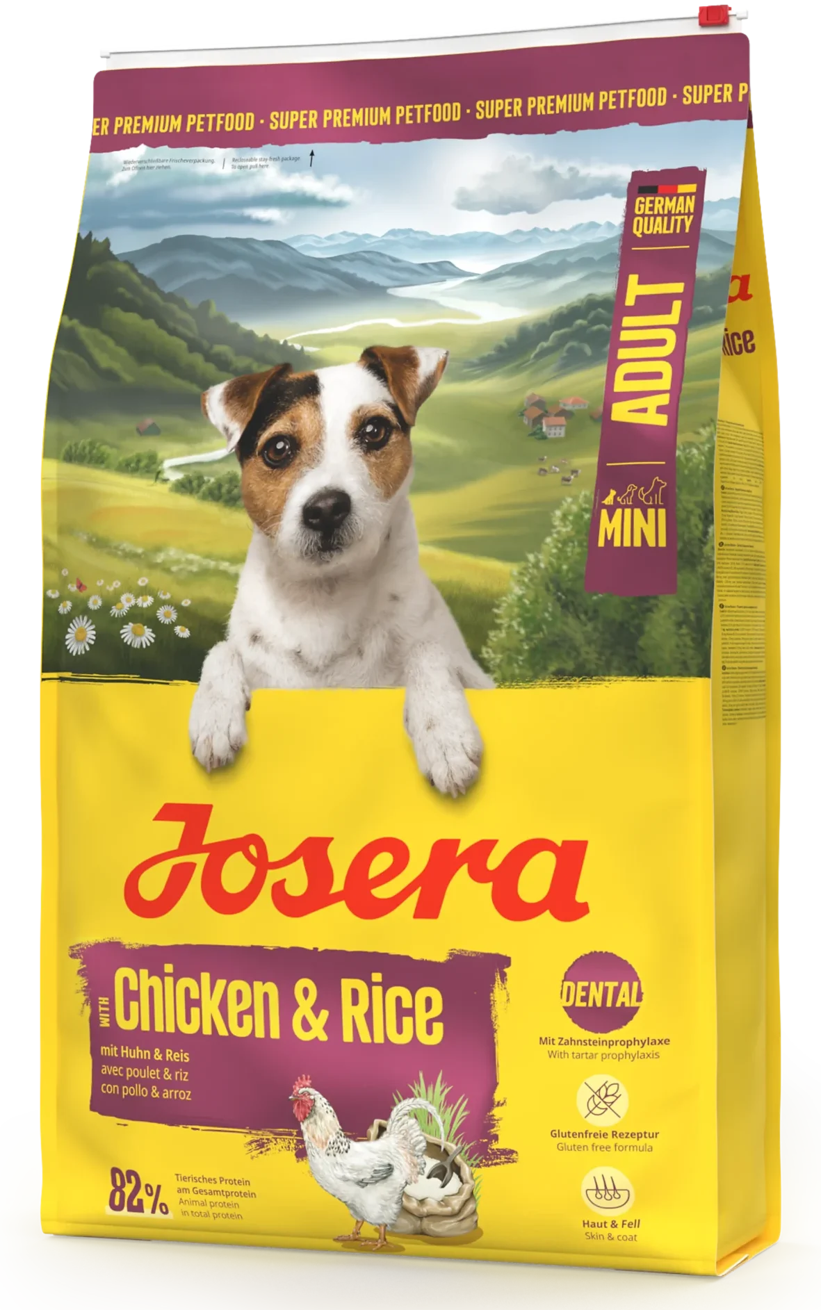 Josera Mini Chicken & Rice Visavertis ėdalas suaugusiems šunims, specialiai pritaikytas specialiems mažų šunų poreikiams – su atitinkamai mažomis granulėmis. Suaugusių šunų ėdalo su vištiena ir ryžiais receptas be glitimo yra gerai toleruojamas ir skanus. Dvikojų draugams taip pat bus malonu išgirsti, kad seilėse esantis kalcis gali sumažinti dantų akmenų susidarymo riziką. Geriausi ingredientai, tokie kaip vertingos riebalų rūgštys, vitaminai, cinkas ir varis, užtikrina gražų, žvilgantį kailį ir gražią odą.