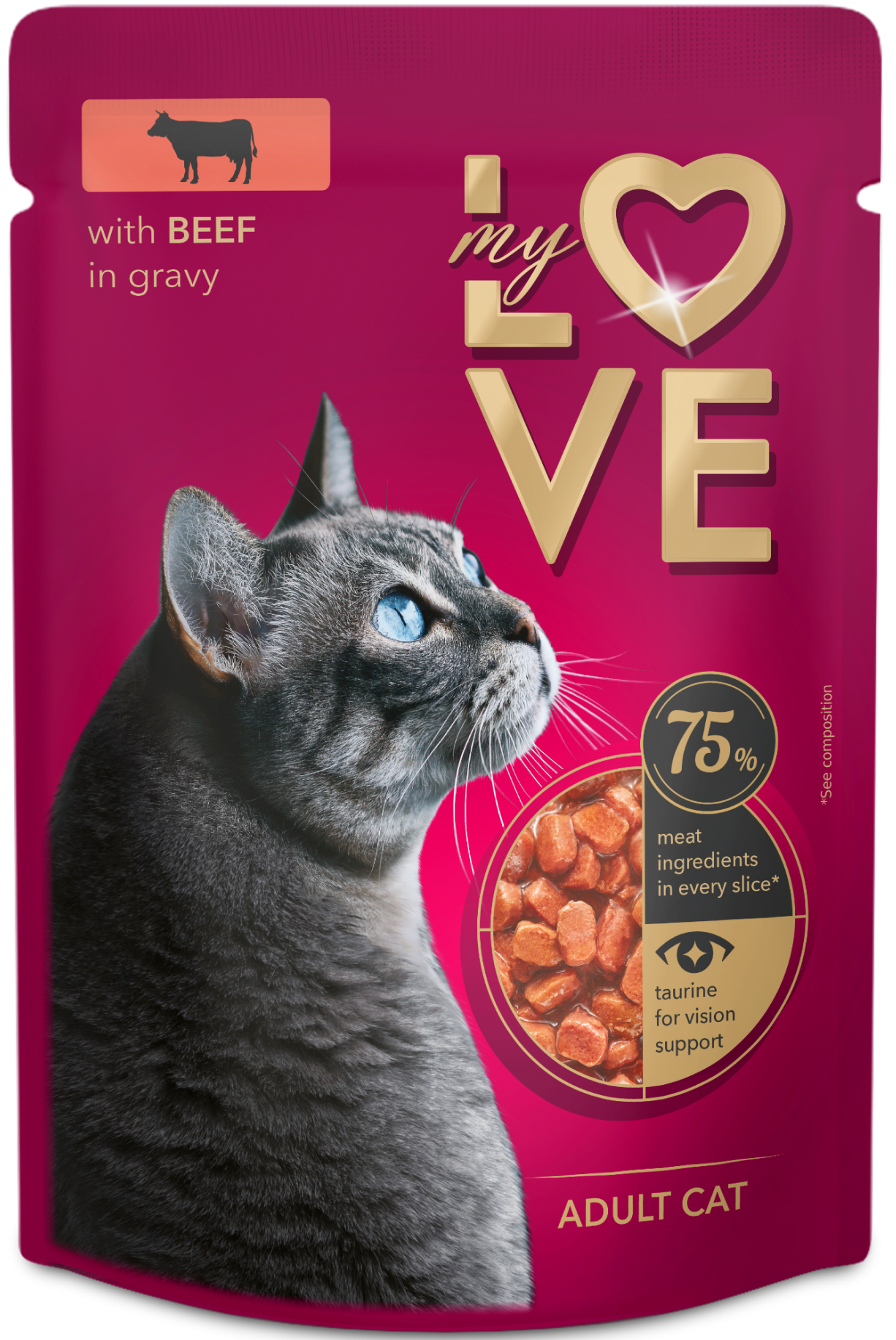 My Love konservai su jautiena padaže suaugusioms katėms My Love drėgnuose ėdaluose yra taurino, svarbaus komponento, kuris palaiko kačių akių sveikatą. Sudėtyje dominuoja mėsos žaliavos ir augaliniai produktai, papildyti vitaminais bei mineralais, kad būtų palaikoma gyvūno sveikata.