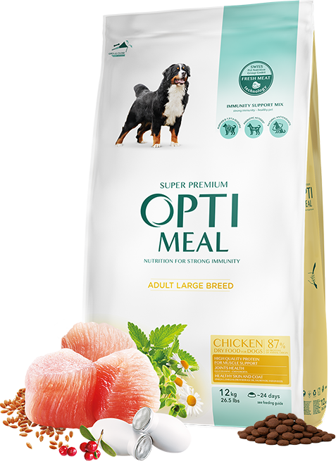 Visavertis sausas pašaras suaugusiems, didelių veislių šunims su vištiena. Natūralūs gliukozamino ir chondroitino šaltiniai palaiko sveikus sąnarius, kurie yra ypač pažeidžiami didelių veislių šunims. Aukštos kokybės baltymai padeda sustiprinti augintinio raumenis. Šviežiai malta vištiena suteikia jūsų šuniui gerai virškinamų gyvulinių baltymų.