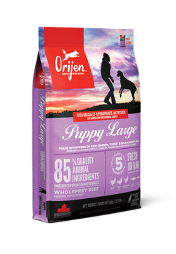 ORIJEN Puppy Large Breed didelių veislių šuniukams, recepte yra 85 % kokybiškų gyvūninių ingredientų, tokių kaip šviežia arba žalia vištiena ir kalakutiena, žuvis ir kiaušiniai. Recepte taip pat naudojami organai ir kaulai – pagal viso grobio (WholePrey) principą.